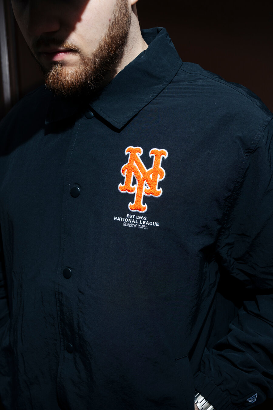 New Era schwarz Podzimní bunda für Männer mit dem Motiv des New York Mets Baseballteams.
