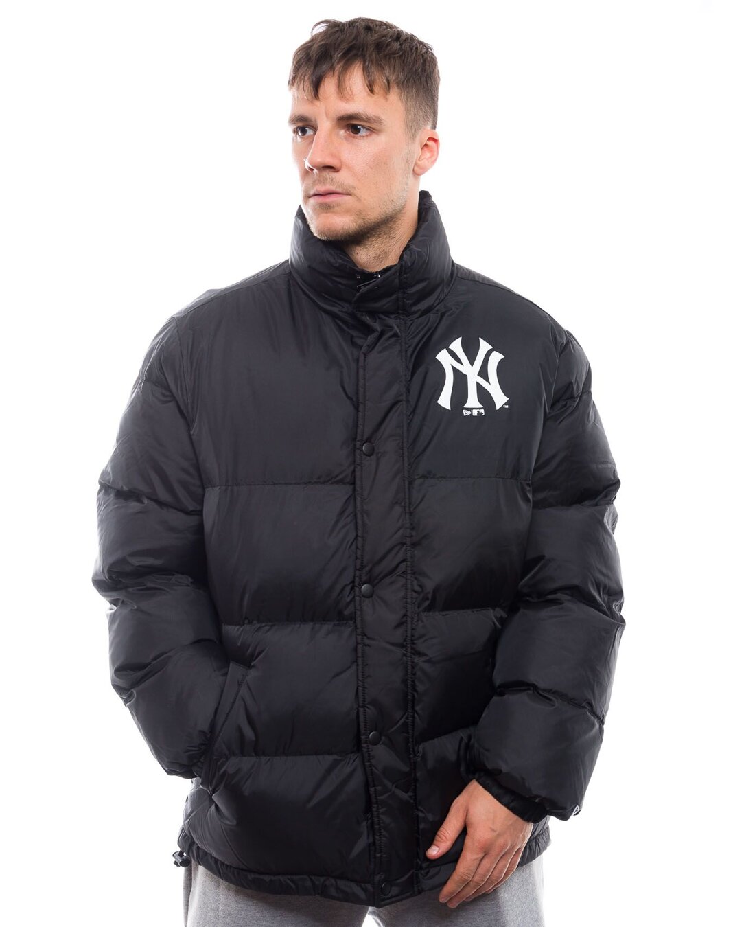 New Era schwarz Zimní bunda für Männer mit dem Motiv des New York Yankees Baseballteams.