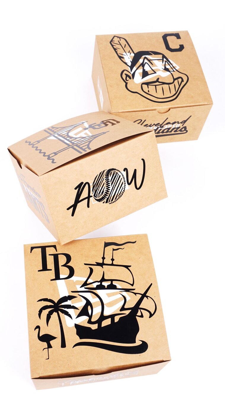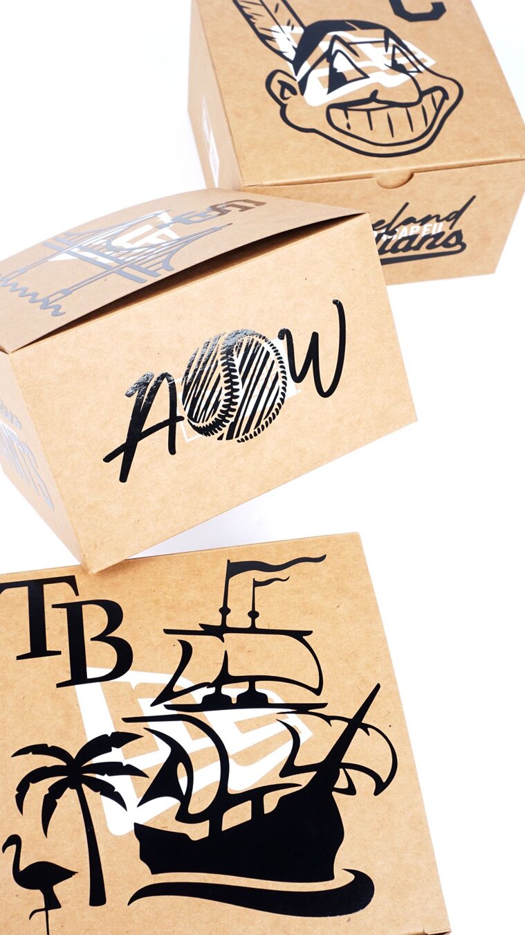 Custom New Era Gift Box, který vidíte na fotkách - upravené pomocí 5 samolepek s motivy týmu, logem Adam Wave a Snapbacks!
