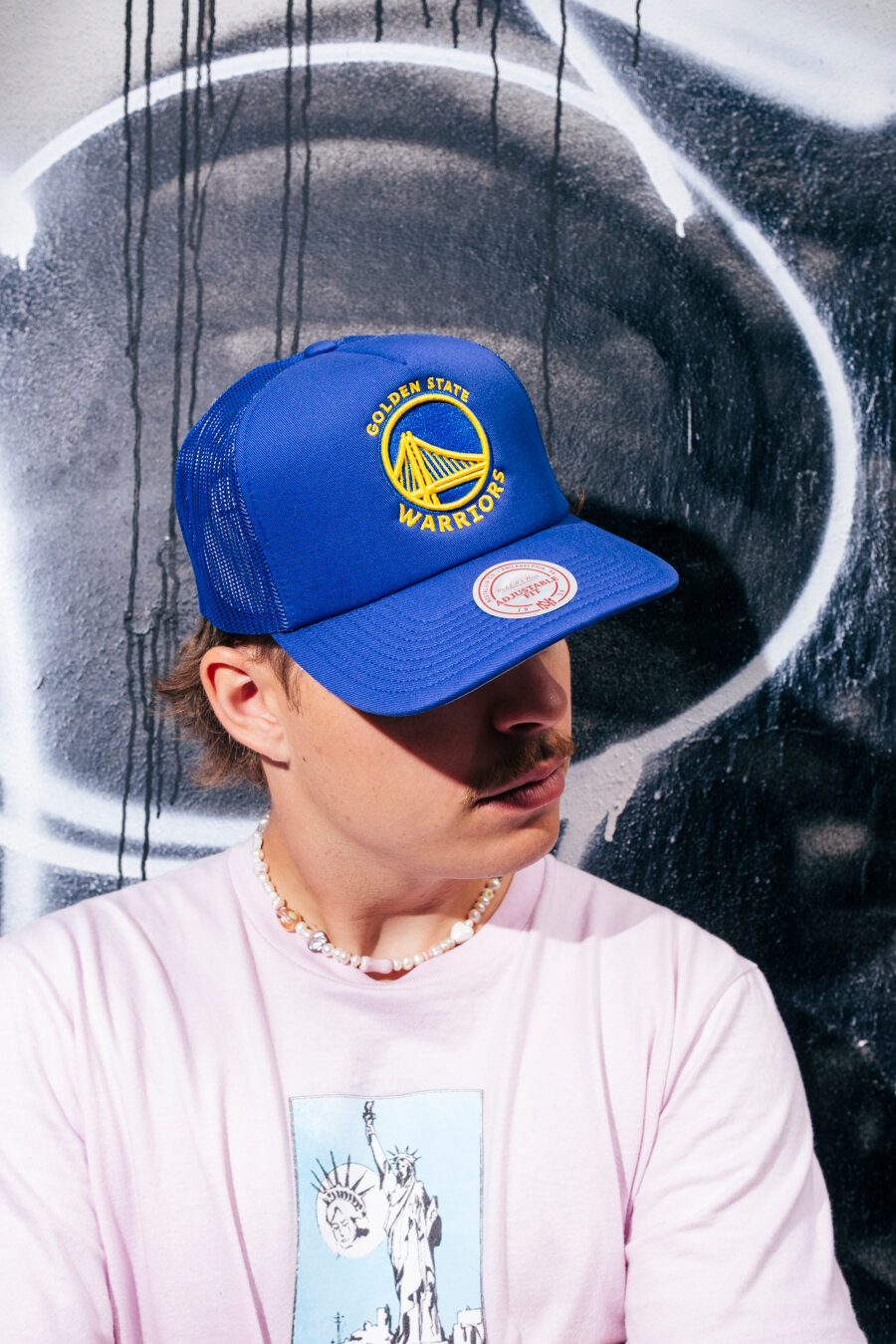 Mitchell & Ness blau Basecap unisex mit dem Motiv des Golden State Warriors Basketballteams.