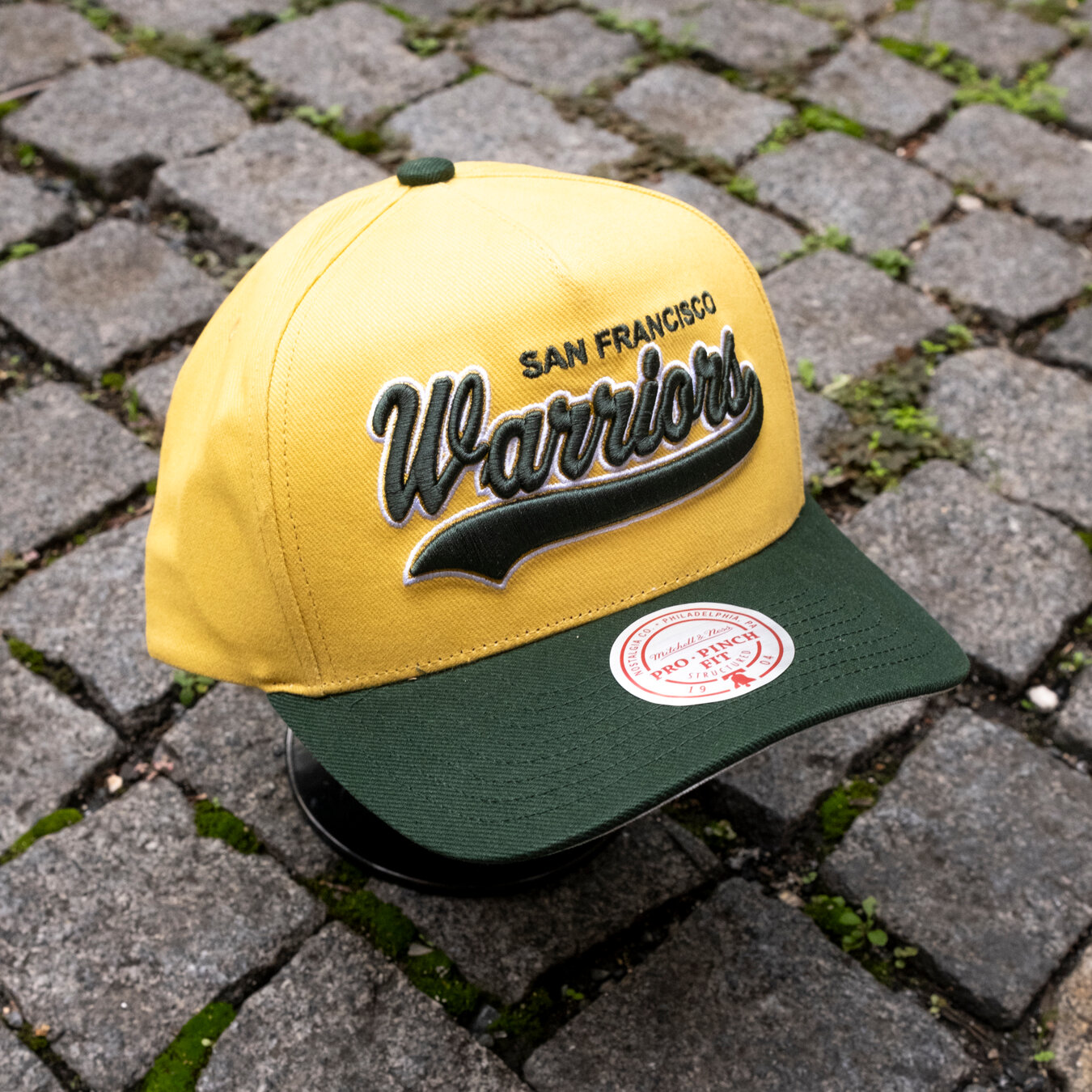 Mitchell & Ness gelb Basecap für Männer mit dem Motiv des Golden State Warriors Basketballteams.