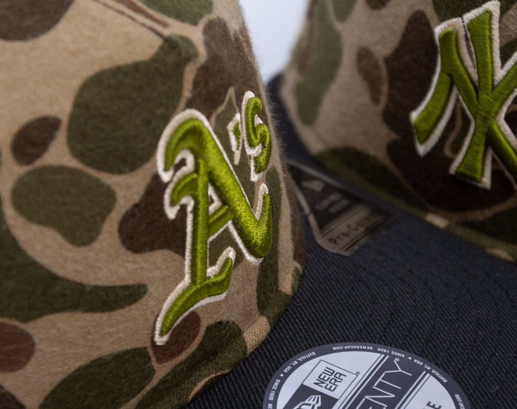 Neokoukané Duck Camo maskáčové provedení, prémiové látky od Three Looms z Japonska, 7 týmů MLB na čele, a jako vždy ikonickou vlajkou New Era na levé straně!