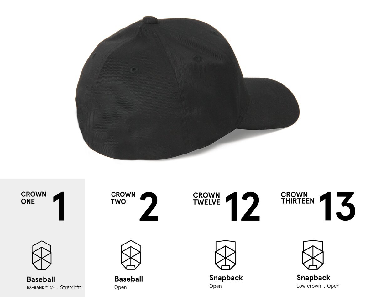 Kšiltovka s korunou CROWN 1 má uvnitř po obvodu strečový pás Ex-Band, který přirozeně obejme hlavu. Vyrábí se tři velikosti a jejich obvod se natáhne do těchto obvodů: